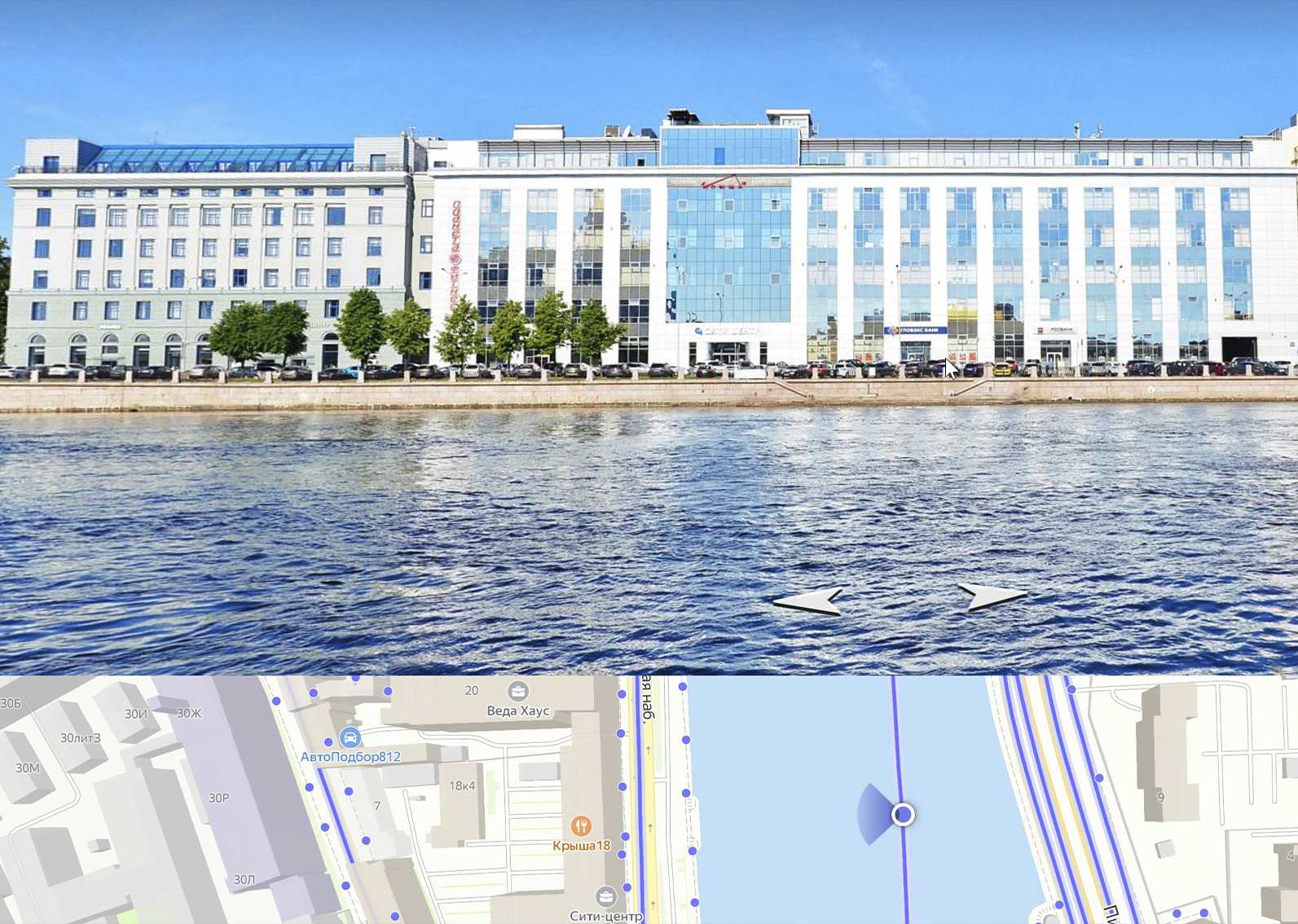 При создании визуализации работы конкретных светильников на фасаде здания для проекта освещения использовался вид с панорамы онлайн-карты.