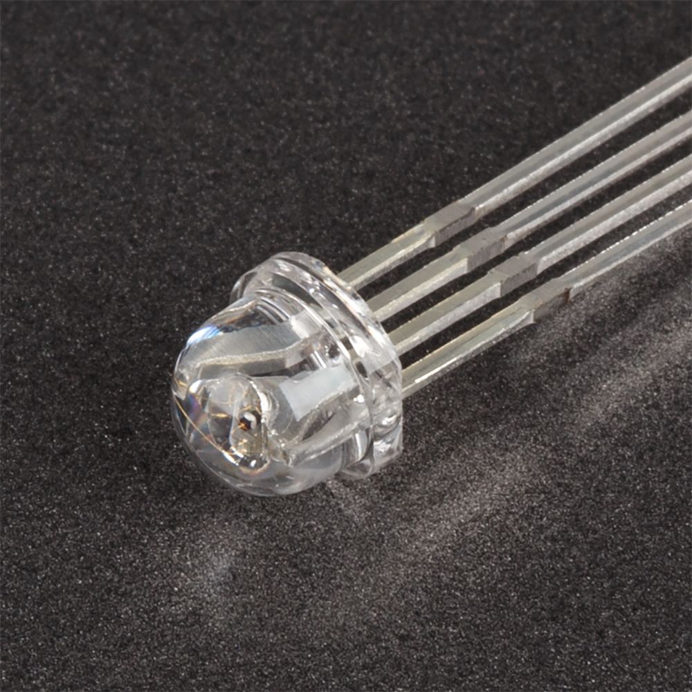 Поставка под заказ от 5000 шт. Выводной круглый светодиод, d=5 мм, прозрачная широкоугольная линза. Цвет свечения RGB: красный (625 нм), зеленый (525 нм), синий (470 нм). Угол излучения 100°. Сила света Iv=400-500 мкд (красный), Iv=800-1200 мкд (зеленый), Iv=300-500 мкд (синий) при If=20 мА. VF=1.9-2.4 В (красный). VF=2.9-3.3 В (зеленый/синий). Четыре вывода, общий катод.