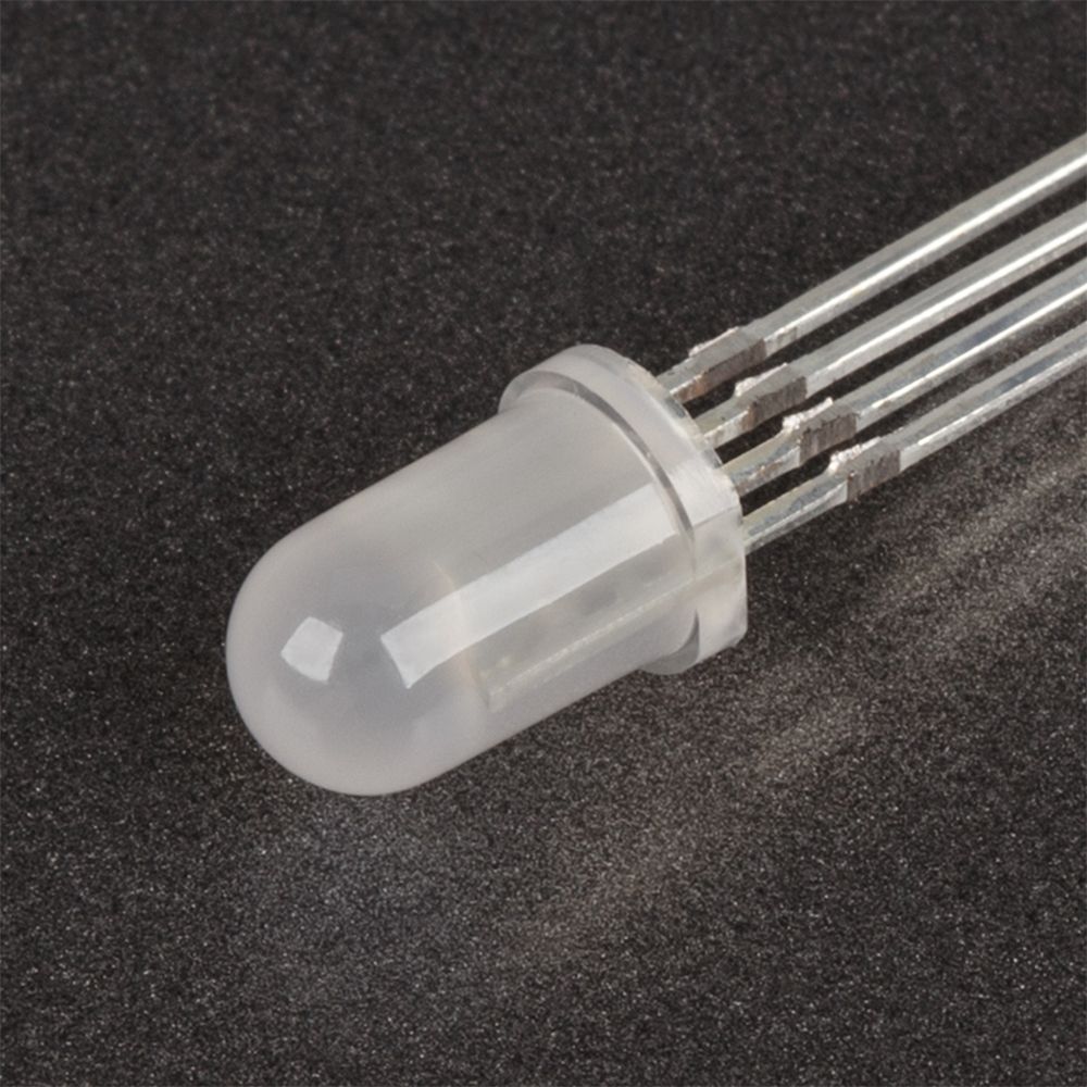 Поставка под заказ от 5000 шт. Выводной круглый светодиод, d=5 мм, белая матовая линза. Цвет свечения RGB: красный (640 нм), зеленый (525 нм), синий (465 нм). Угол излучения 60°. Сила света Iv=800-1500 при If=20 мА. VF=1.9-2.5 В (красный). VF=2.9-3.5 В (зеленый/синий). Четыре вывода, общий анод.
