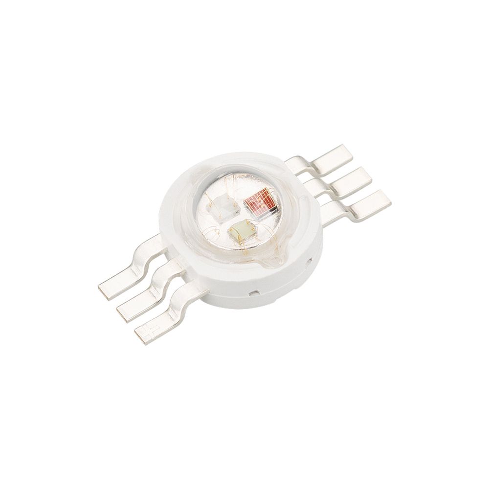 Мощный светодиод типа Emitter, d=10 мм, h=5.8 мм. Чипы EPILEDS 32-35 mil. Цвет свечения RGB: красный (620-630 нм), зеленый (520-530 нм), синий (460-470 нм). Угол излучения 120-140°. Световой поток 55 лм (красный), 85 лм (зеленый), 25 лм (синий) при If=350 мА, P max=3 Вт. VF=2.0-2.4 В. Управляется RGB контроллером тока, или любым RGB-контроллером через конвертор сигнала напряжения в ток.