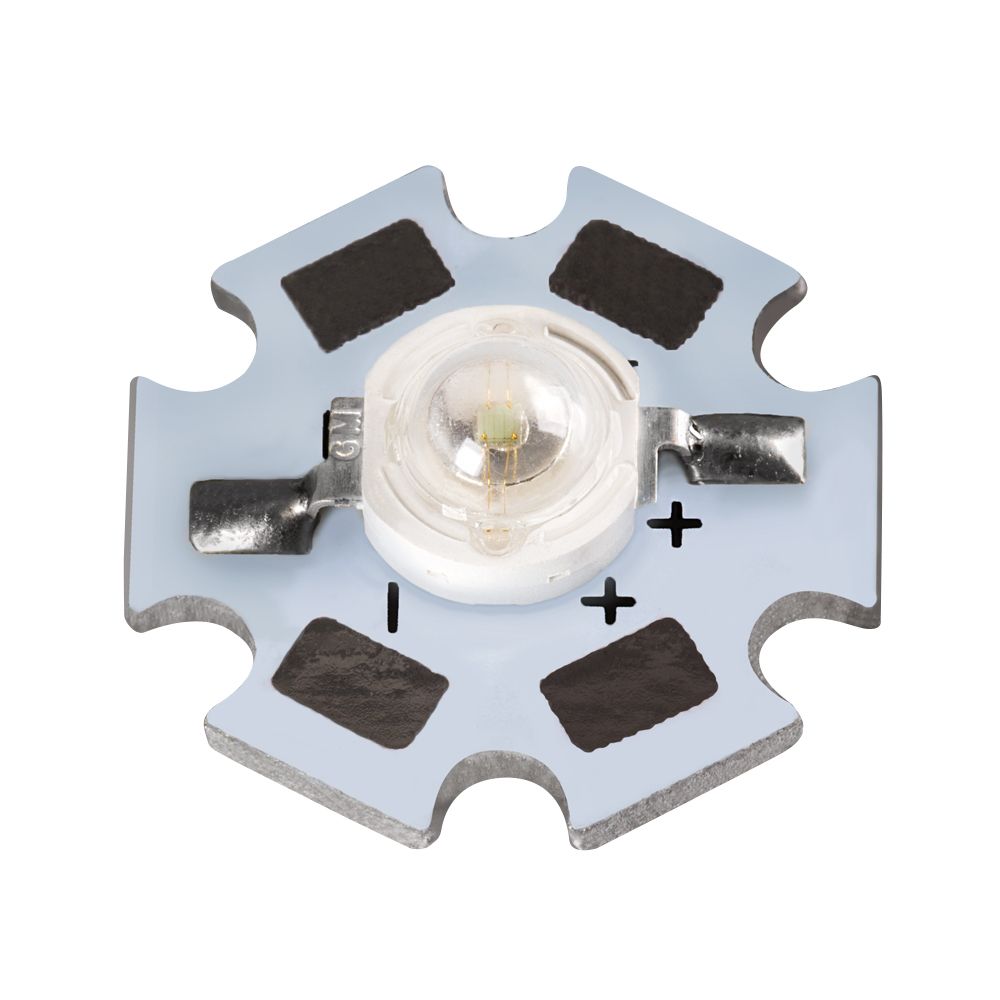 Мощный светодиод на плате типа STAR, d=20 мм, h=8 мм. Чип EPILEDS 42 mil, прозрачная линза. Цвет свечения красный (620-630 нм). Угол излучения 120-140°. Световой поток 100-120 лм при If=700 мА, P=3 Вт. VF=2.4-2.6 В.