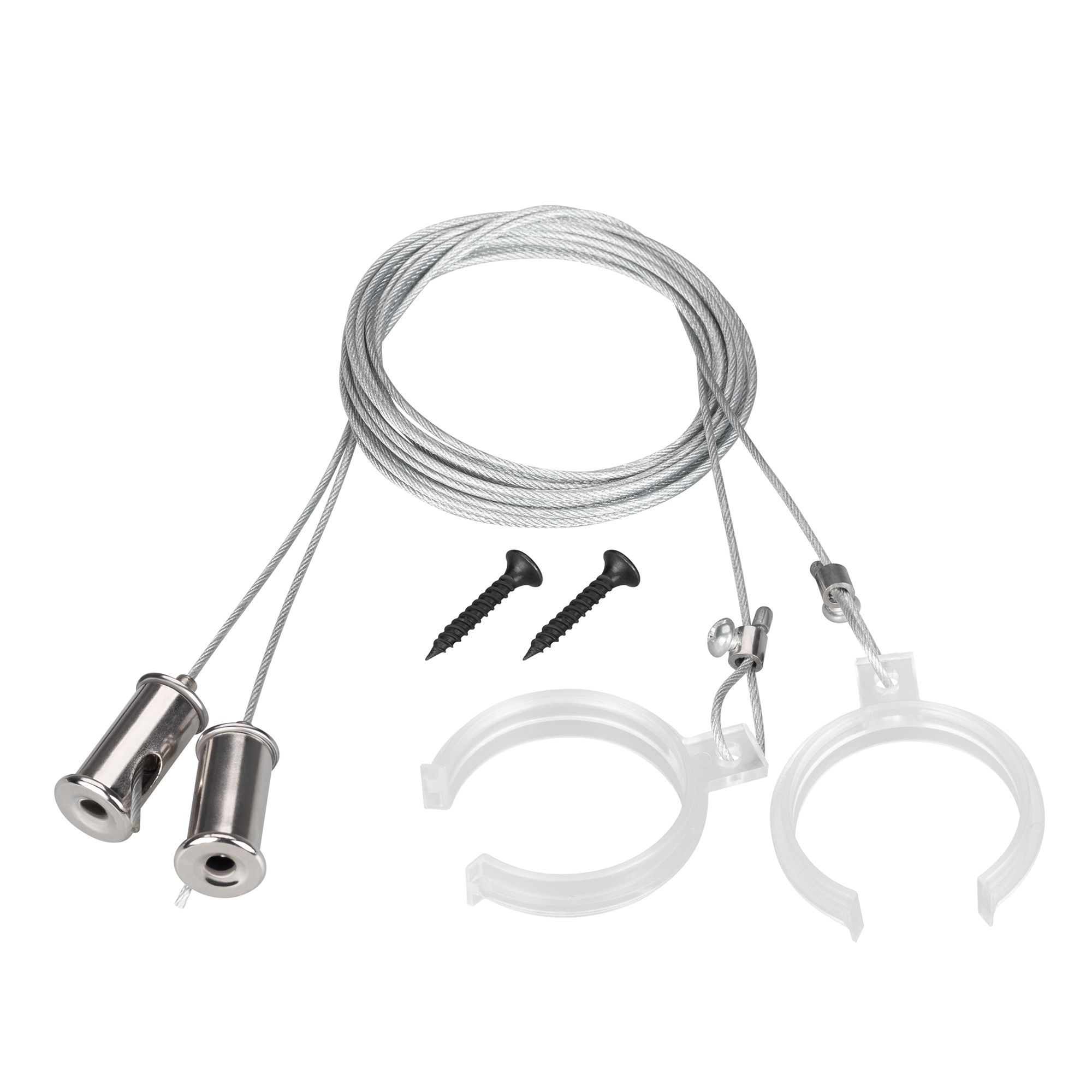 Подвес для профиля WPH-FLEX-D40. В комплекте: стальной трос 2 м серебристого цвета - 2 шт., прозрачный пластиковый держатель - 2 шт., шуруп - 2 шт. Максимальная нагрузка на 1 трос 10 кг. Рекомендуется использовать не менее двух тросов на 1 метр профиля. Цена за комплект.