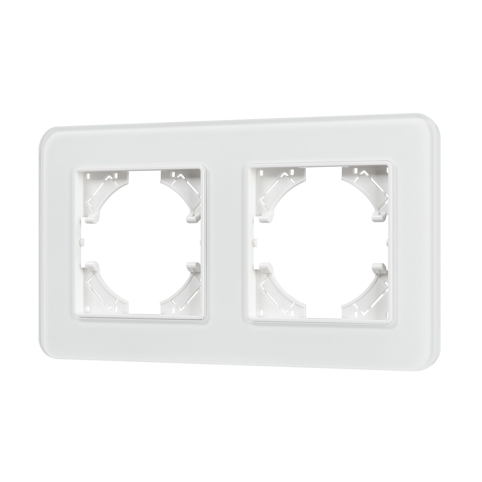 Рамка стеклянная на 2 поста, под встраиваемый механизм. Цвет - белый. Среднего уровня герметичности IP20. Ориентация монтажа - горизонтальная (основным ориентиром служат посадочные выступы для накладки механизма).