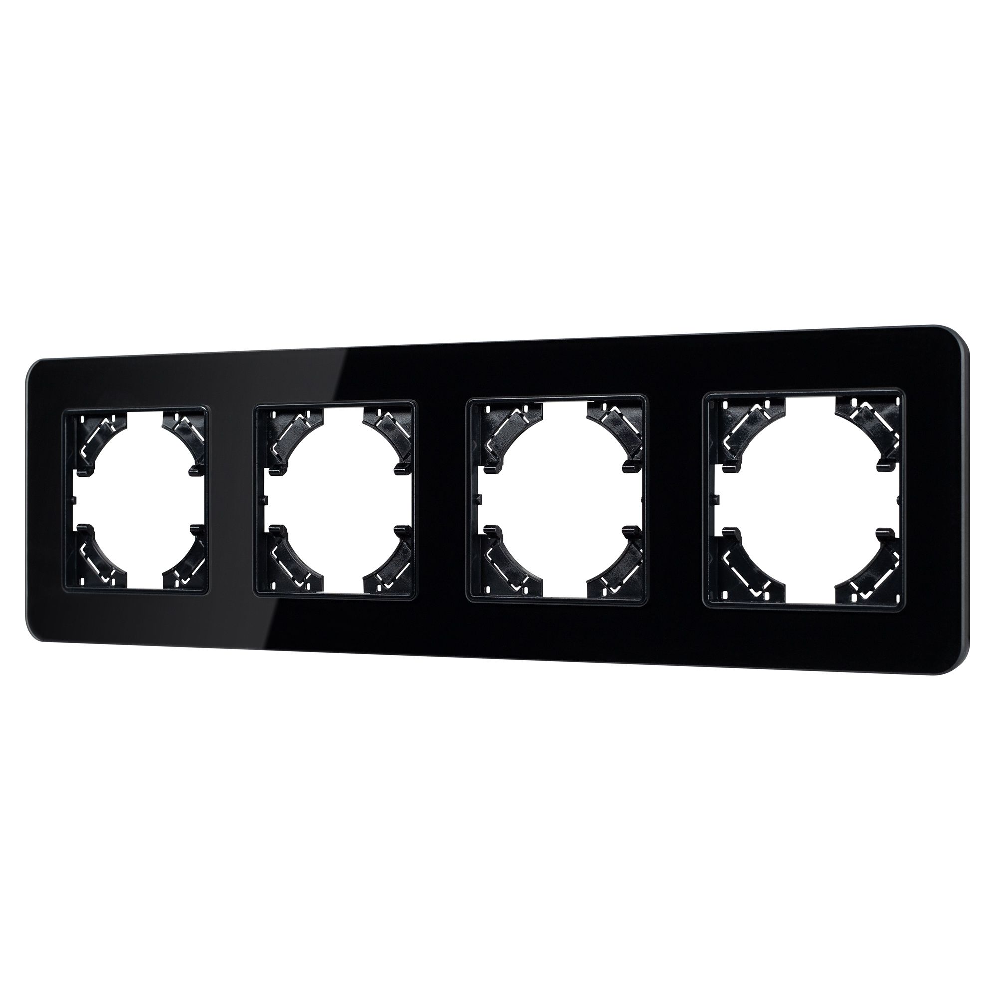 Рамка стеклянная на 4 поста, под встраиваемый механизм. Цвет - черный. Среднего уровня герметичности IP20. Ориентация монтажа - горизонтальная (основным ориентиром служат посадочные выступы для накладки механизма).