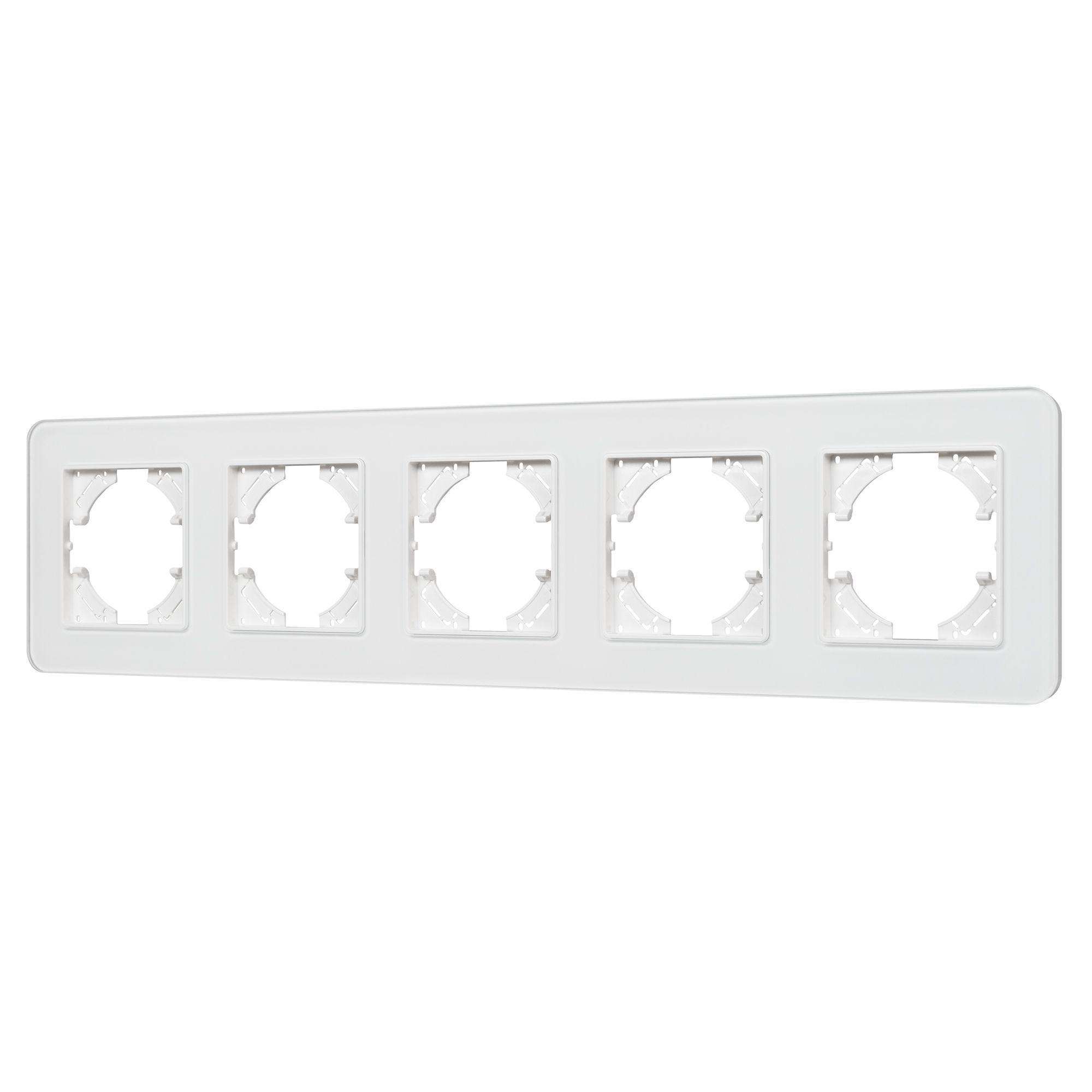 Рамка стеклянная на 5 постов, под встраиваемый механизм. Цвет - белый. Среднего уровня герметичности IP20. Ориентация монтажа - горизонтальная (основным ориентиром служат посадочные выступы для накладки механизма).