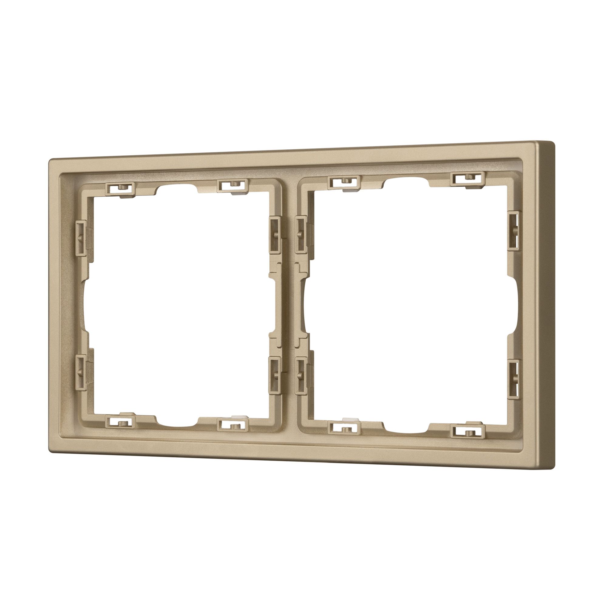 Рамка пластиковая на 2 поста, под встраиваемый механизм. Цвет - золотой, с Soft-Touch покрытием. Среднего уровня герметичности IP20. Ориентация монтажа горизонтальная.