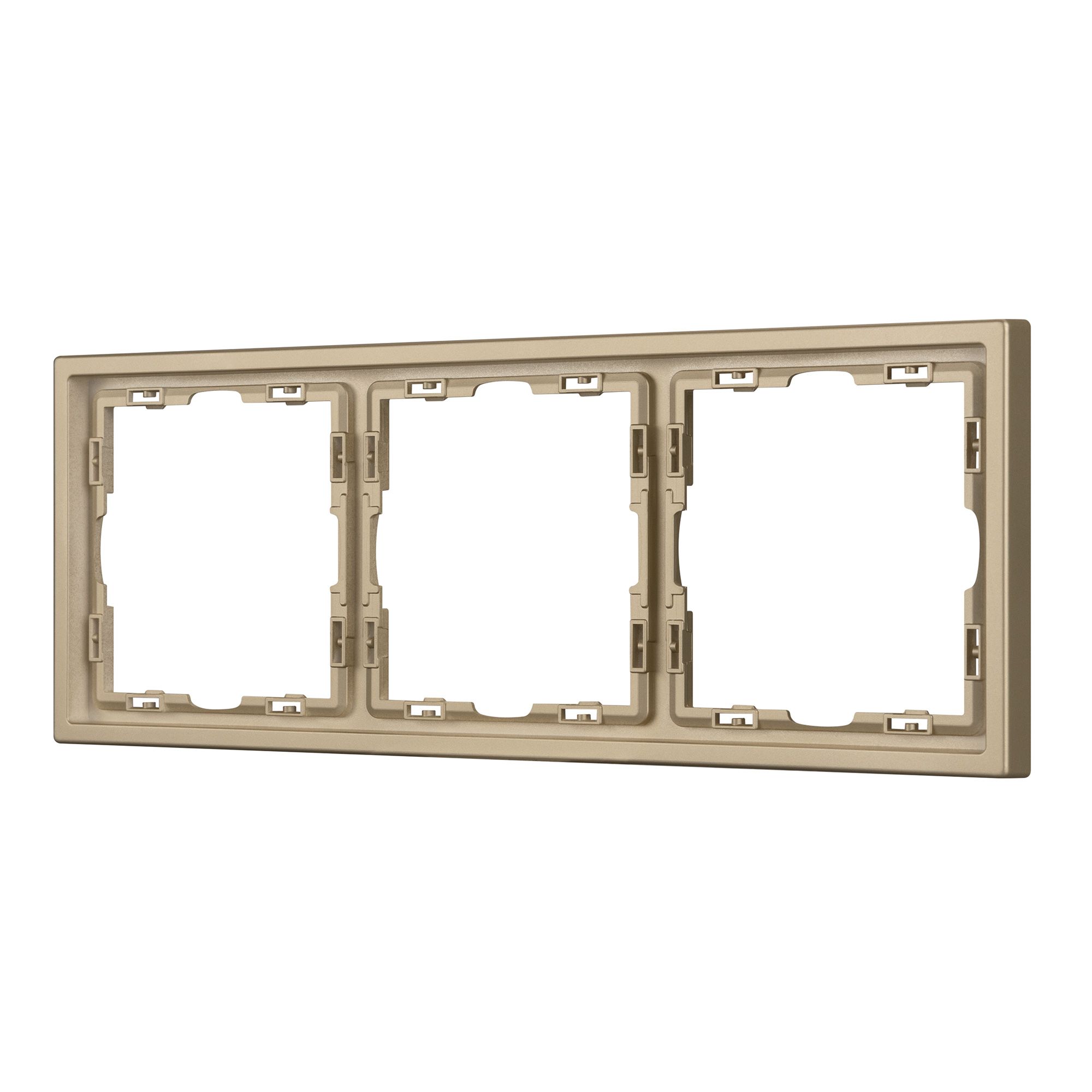 Рамка пластиковая на 3 поста, под встраиваемый механизм. Цвет - золотой, с Soft-Touch покрытием. Среднего уровня герметичности IP20. Ориентация монтажа горизонтальная.