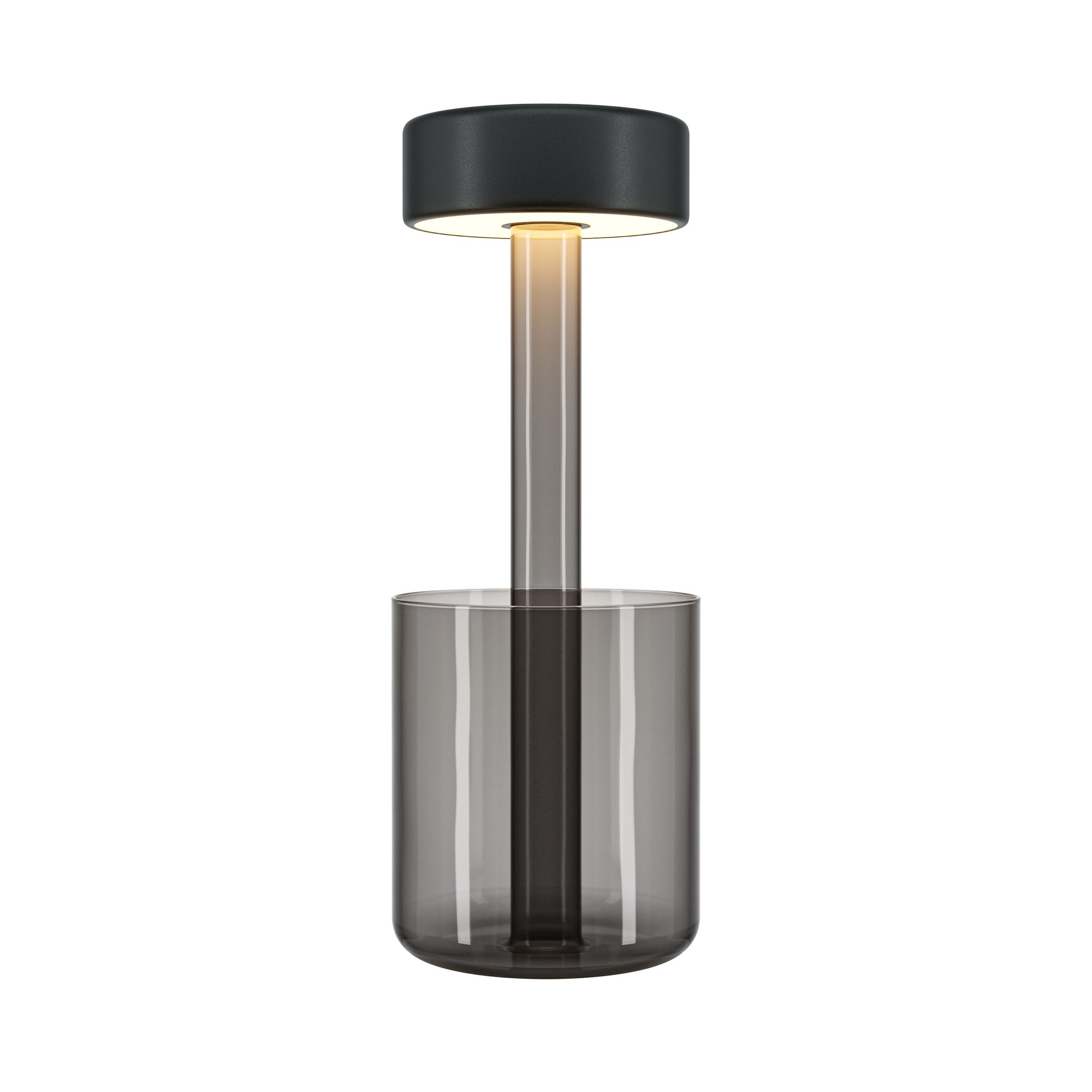 Портативный настольный светильник. Результат творческой коллаборации искусственного интелекта и предметного дизайнера. Два варанта корпуса светильника: с металлической тонкой ножкой на плоском круглом основании; со стеклянным основанием с интегрированным в него вазой. Плафон снимается с основания для удобного ухода за стеклянными элементами и подзарядки аккумулятора, расположенного в плафоне. Два варианта цвета стеклянных моделей - прозрачный и серый. Плафоны с рассеивателем из акрила в 3х цветах: черный, золотой, белый. Удобный сенсорный выключатель вверху плафона. Micro USB разъем для подзарядки скрыт в нижней части плафона. LED-источник света. Регулируемая цветовая температура от 2200К до 4000К.