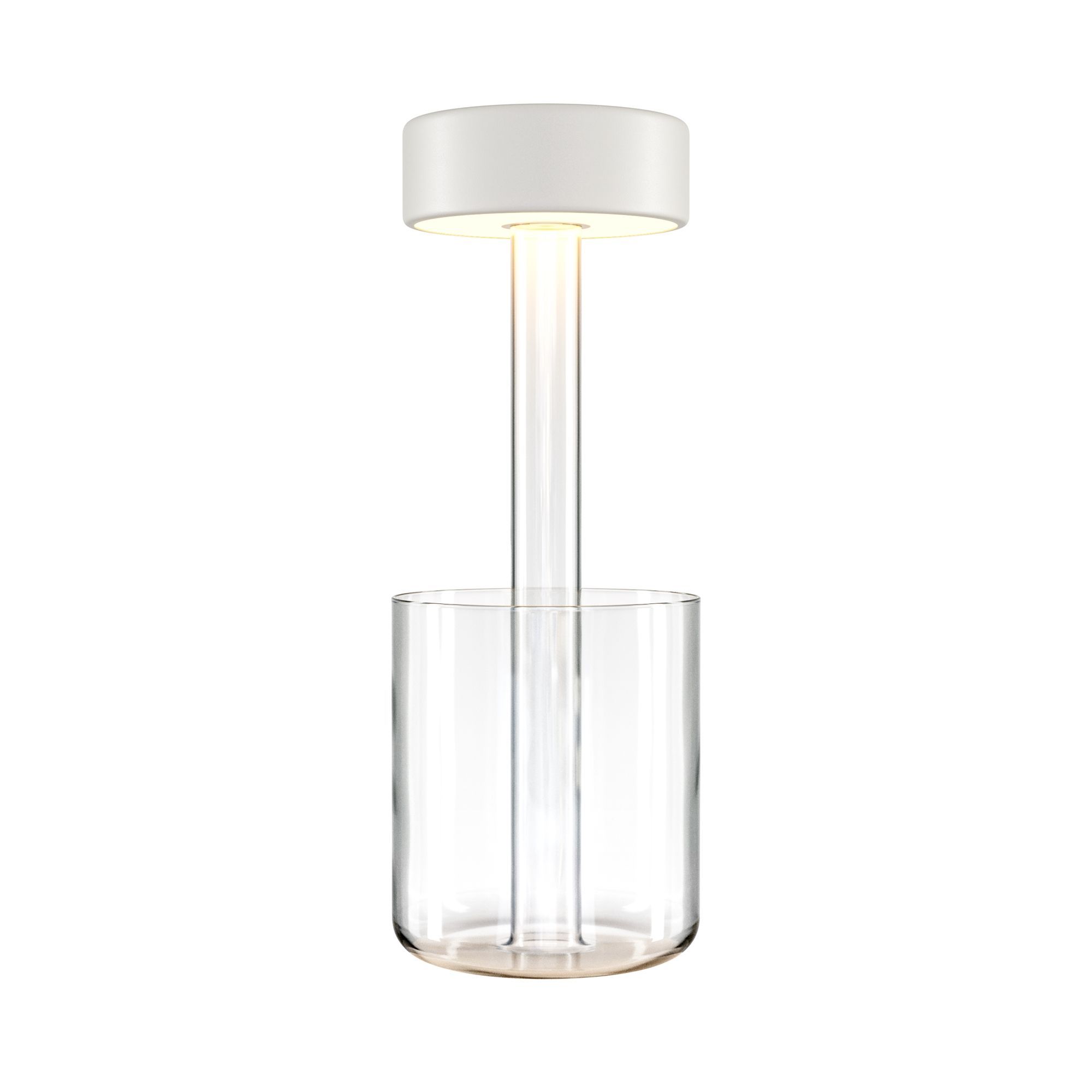 Портативный настольный светильник. Результат творческой коллаборации искусственного интелекта и предметного дизайнера. Два варанта корпуса светильника: с металлической тонкой ножкой на плоском круглом основании; со стеклянным основанием с интегрированным в него вазой. Плафон снимается с основания для удобного ухода за стеклянными элементами и подзарядки аккумулятора, расположенного в плафоне. Два варианта цвета стеклянных моделей - прозрачный и серый. Плафоны с рассеивателем из акрила в 3х цветах: черный, золотой, белый. Удобный сенсорный выключатель вверху плафона. Micro USB разъем для подзарядки скрыт в нижней части плафона. LED-источник света. Регулируемая цветовая температура от 2200К до 4000К.