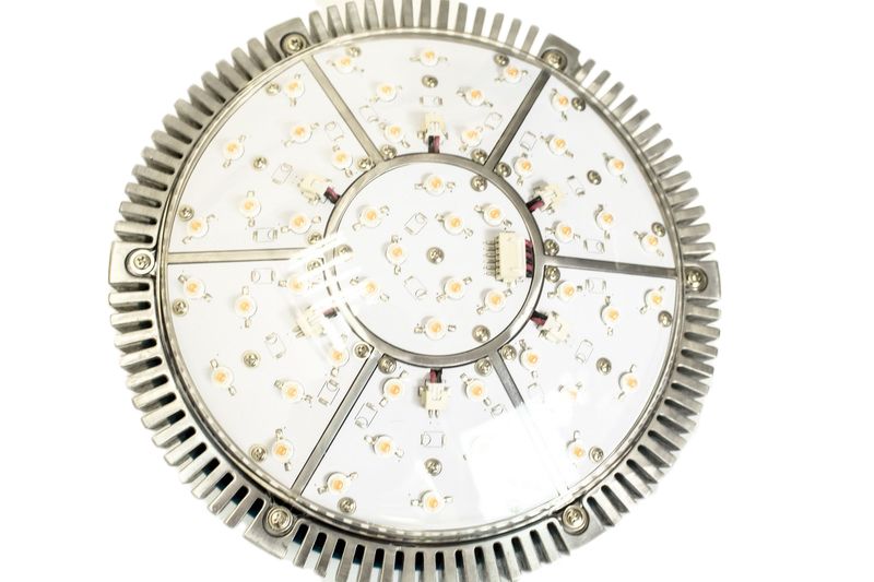 UFO – это мощный светодиодный светильник для ускорения роста растений, использующий полный фитоспектр с наибольшими пиками в областях 660 и 460 нм. Основная особенность данного светильника заключается в том, что у него отсутствуют фокусирующие линзы, что дает "рассеянный" свет, который более благоприятно усваивается растениями, а за счет выпуклой формы диодных модулей эффективно покрывается сравнительно большая площадь, несмотря на требуемую низкую высоту подвеса.