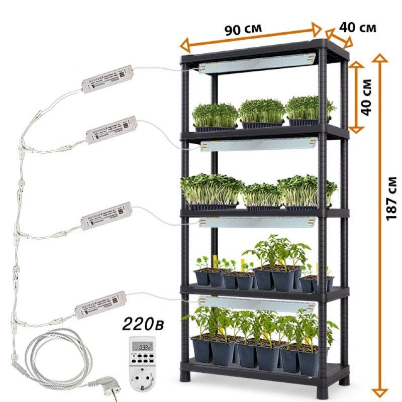 Универсальный стеллаж 187*90*40 - 1 шт. Расстояние между полками 40 см. Стеллаж имеет модульную конструкцию, за счет этого очень просто и быстро собирается. Максимальная нагрузка на полку 70 кг, и этого достаточно, чтобы расположить на них горшки с цветами или рассадой. Также предусмотрено крепление стеллажа к стене.