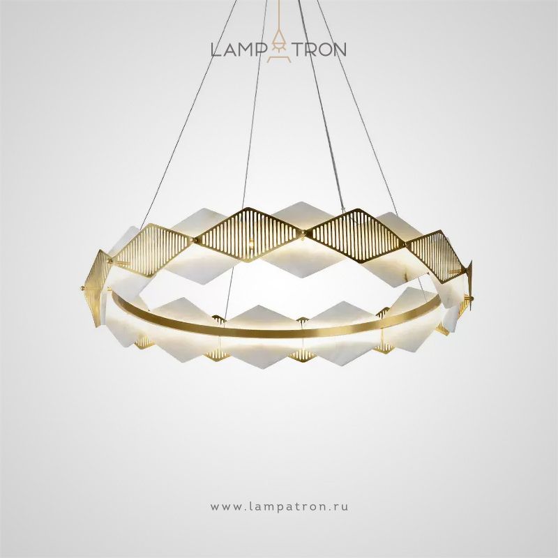 Серия кольцевых люстр на струнном подвесе с комбинацией мраморных рассеивателей и перфорированных пластин ромбической формы