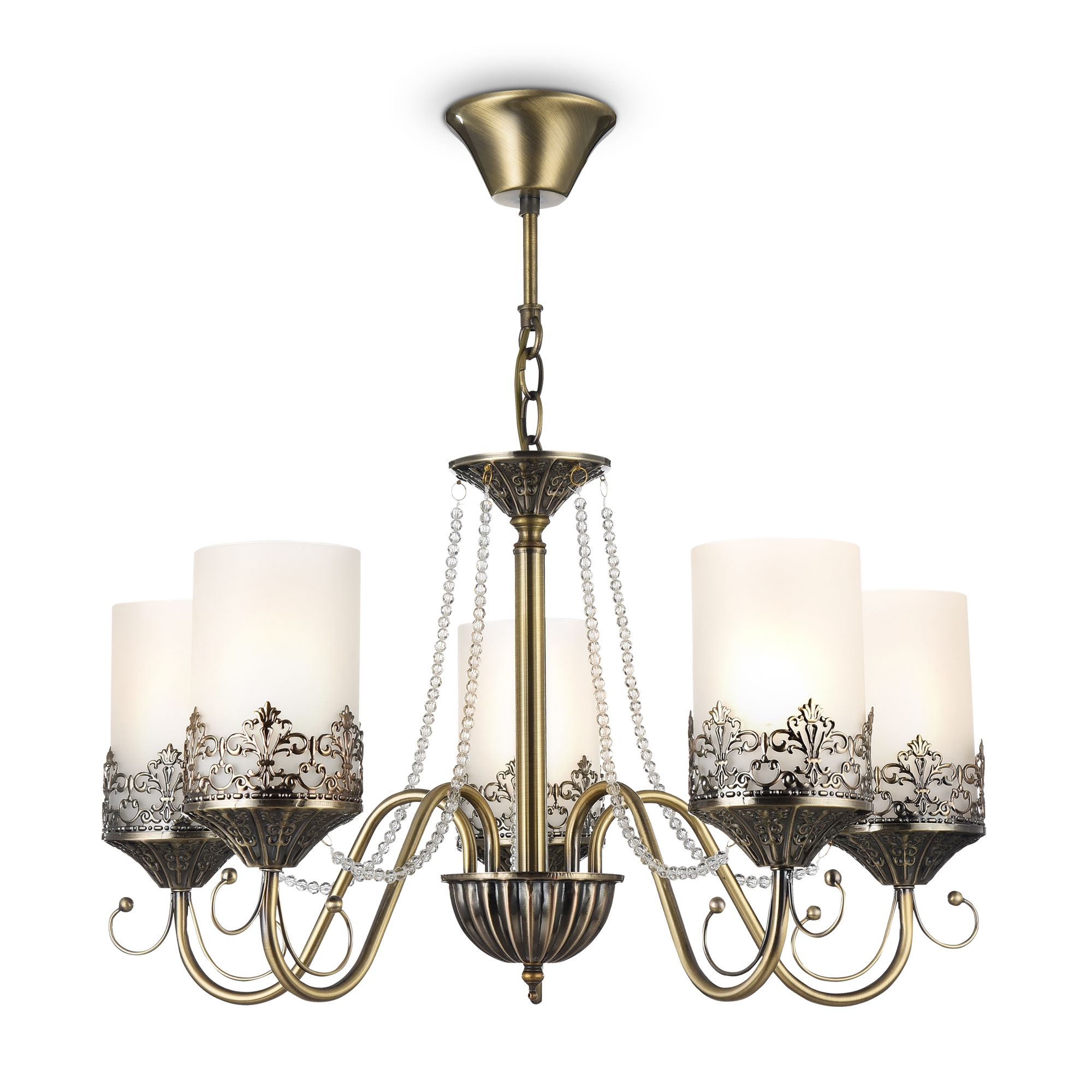 Нарядные и стильные светильники – прекрасное решение для интерьеров в современном стиле. Металлическая арматура окрашена в бронзовый цвет, плафоны из матового стекла в виде "свечек". Основание изделий и розетки украшены объемным орнаментом. Также светильники дополнены подвесками.