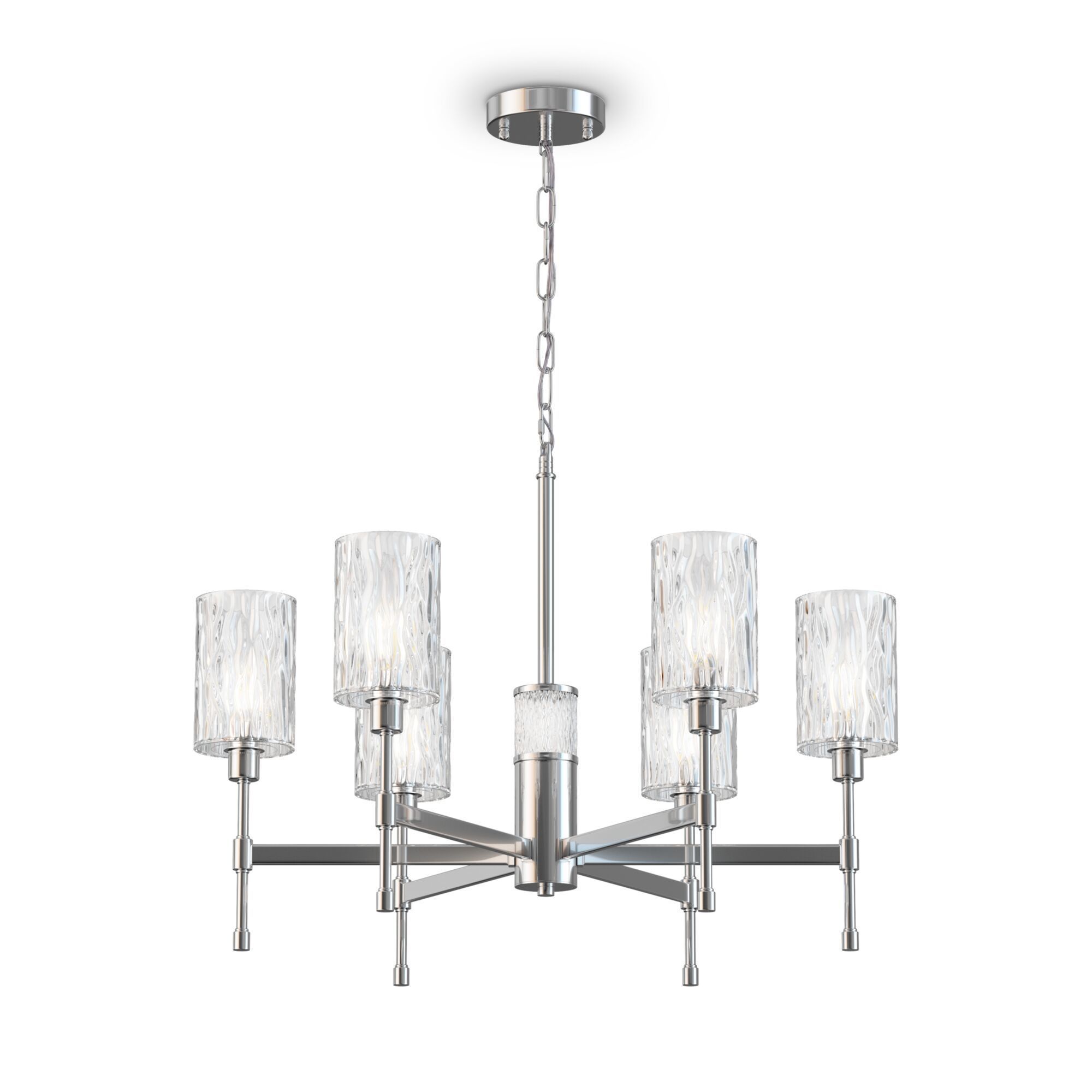 Хромированная металлическая арматура. Плафоны – фактурное прозрачное стекло. В качестве источника света используется лампа с цоколем Е14.
