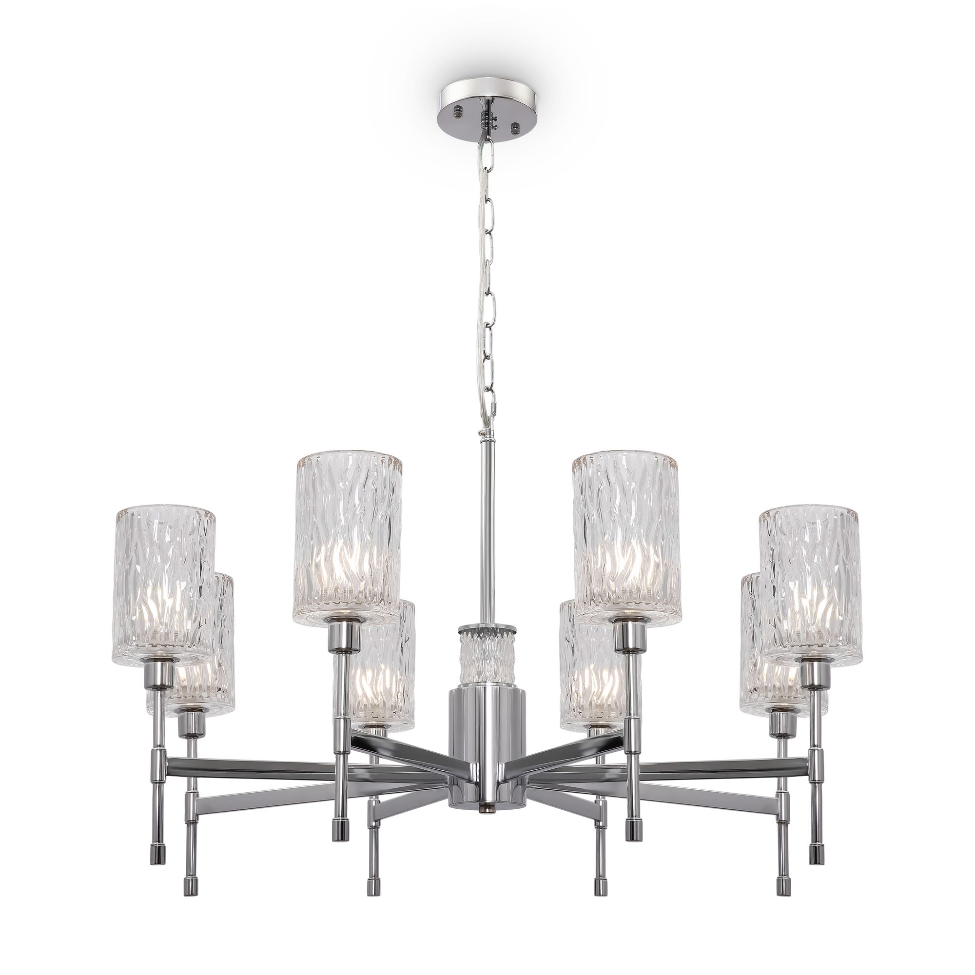 Хромированная металлическая арматура. Плафоны – фактурное прозрачное стекло. В качестве источника света используется лампа с цоколем Е14.