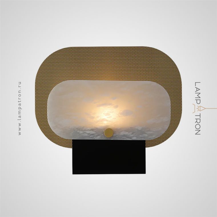 Серия настольных ламп в виде металлической перфорированной пластины и рассеивателя из натурального камня