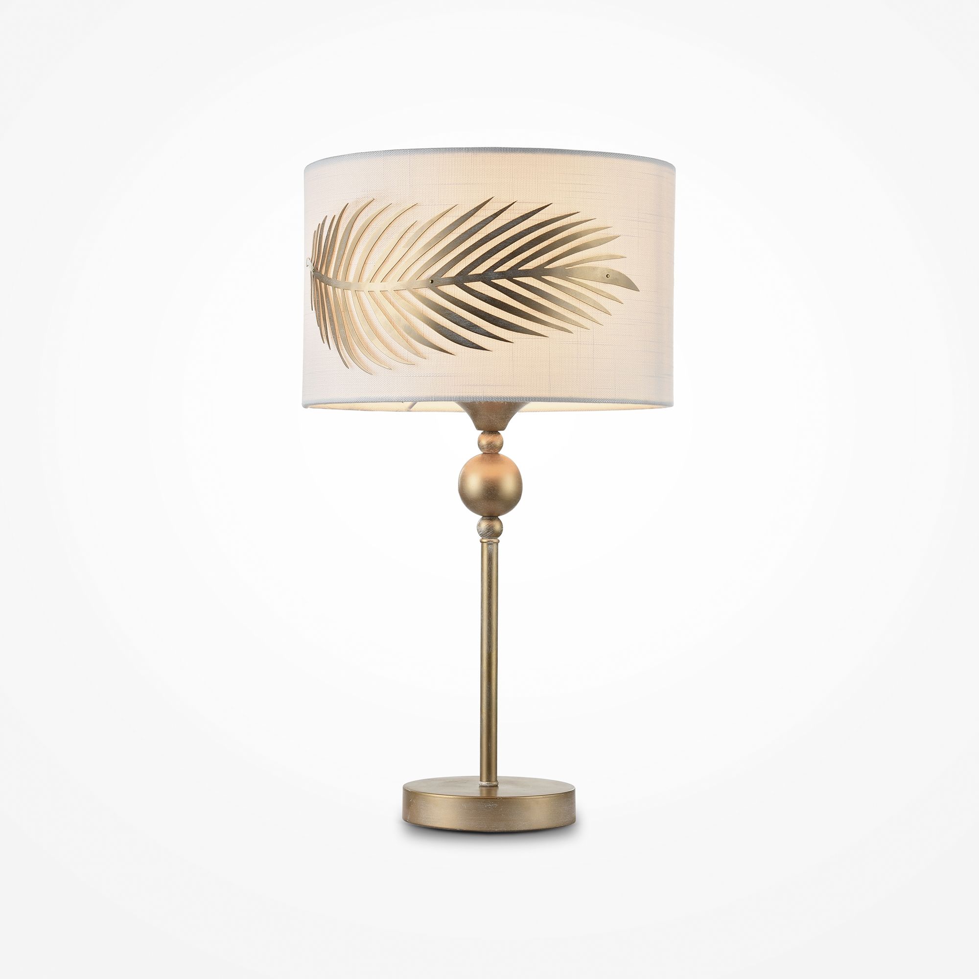 Арматура из металла, цвет – золото. Абажур – белый текстиль на ПВХ. Декор – пальмовая ветвь из листового металла. Рассеиватель фиксируется декоративным наконечником. Высота люстр регулируется.