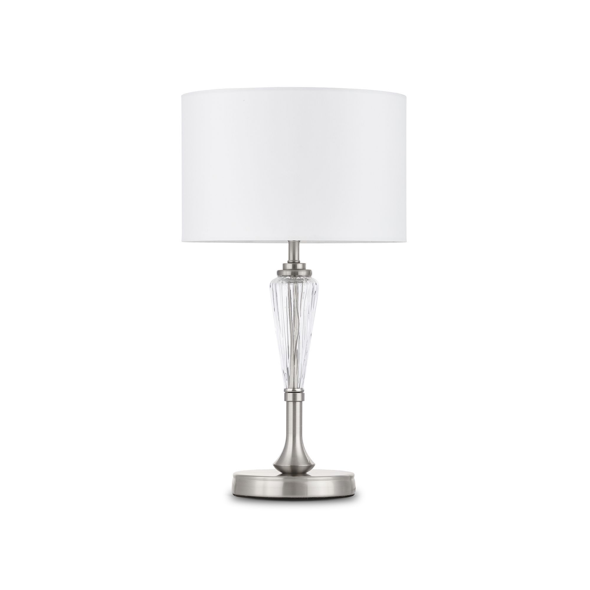 Материал основания – металл, цвет – никель. Абажуры из белой ткани на ПВХ. Декор центральной части и рожков – прозрачное литое стекло с рельефной фактурой. Высота люстр регулируется длиной цепи.