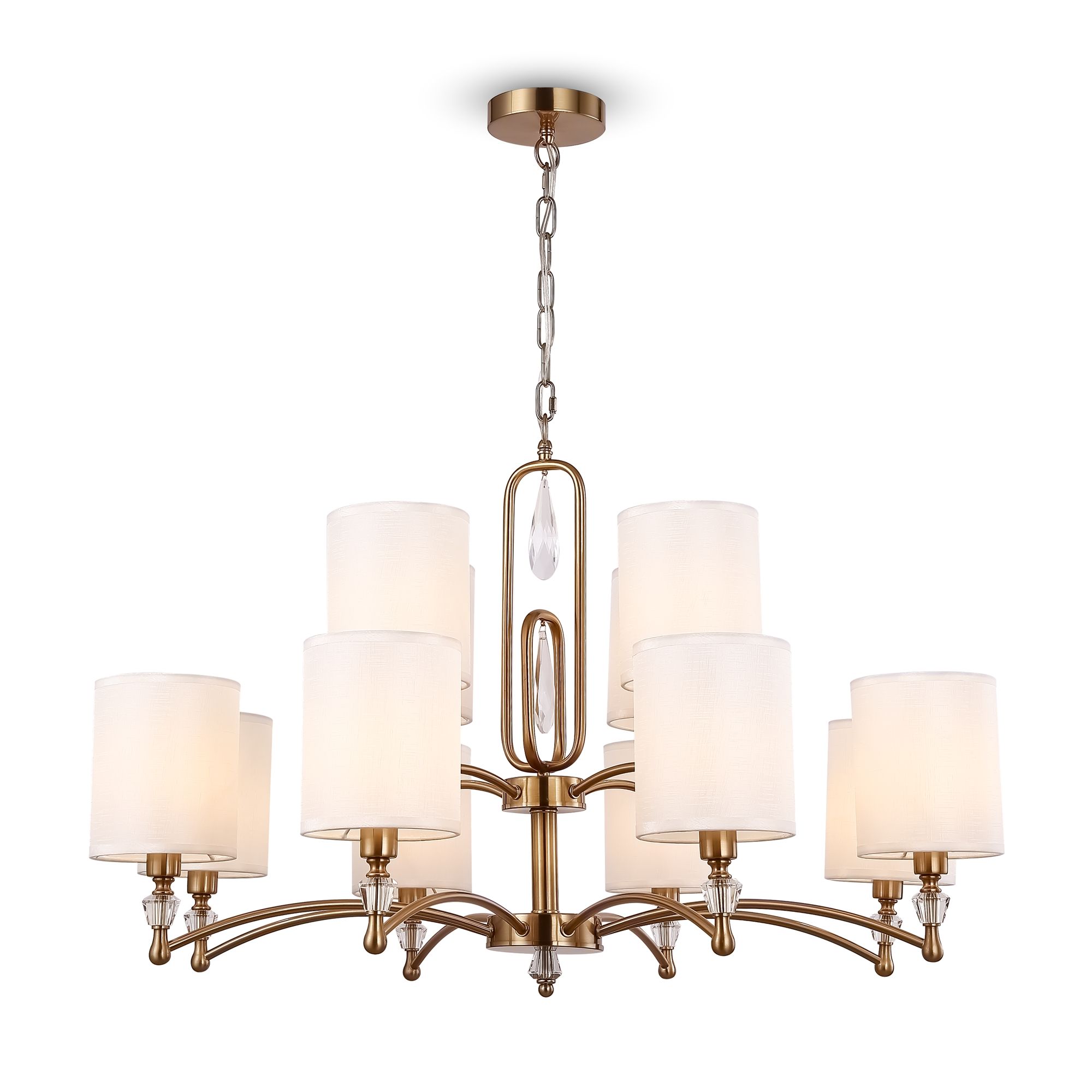 Материал арматуры – нержавеющая сталь, цвет – хром. Материал абажуров – текстиль на ПВХ, цвет – белый. Декор – прозрачное стекло. Акцентные стеклянные кристаллы на рожках со сложной огранкой.