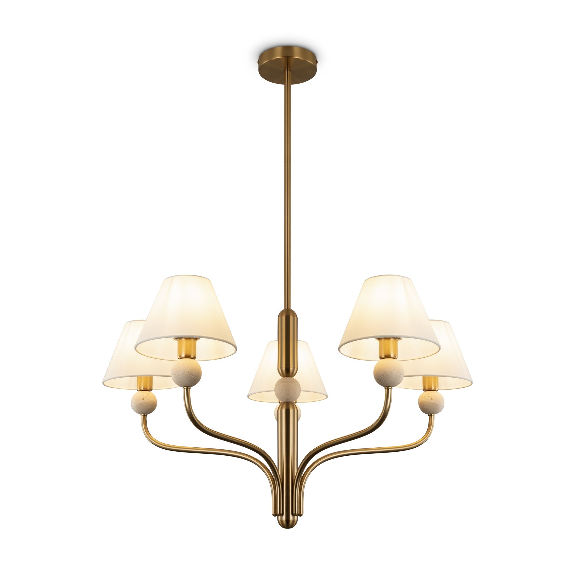 Арматура - металл в цвете латунь. Тканевые абажуры, травертиновые элементы. Лампы E14 (в комплекте). Серия состоит из люстры c 5 плафонами и бра. Трендовое сочетание в классическом стиле.