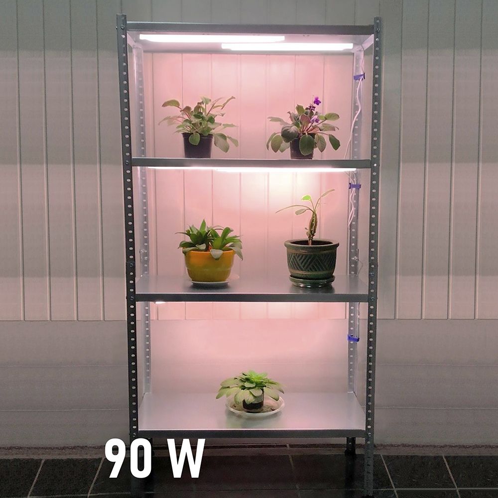 Стеллаж имеет оптимальную высоту полок 41-42 см. и идеален для выращивания растений и рассады в домашних условиях. Укомплектован шестью фитосветильниками специального спектра свечения "Фотосинтез" на 15 Вт каждый. Все фитосветильники связаны и питаются от сети 220 V через единый провод и розетку, при этом каждая из ламп оборудована собственным выключателем. Фитолампы мобильны, легко отделяются от общей конструкции и монтируются на свои места, поэтому удобны в траспартировке и использовании для досветки растений в парнике или теплице.