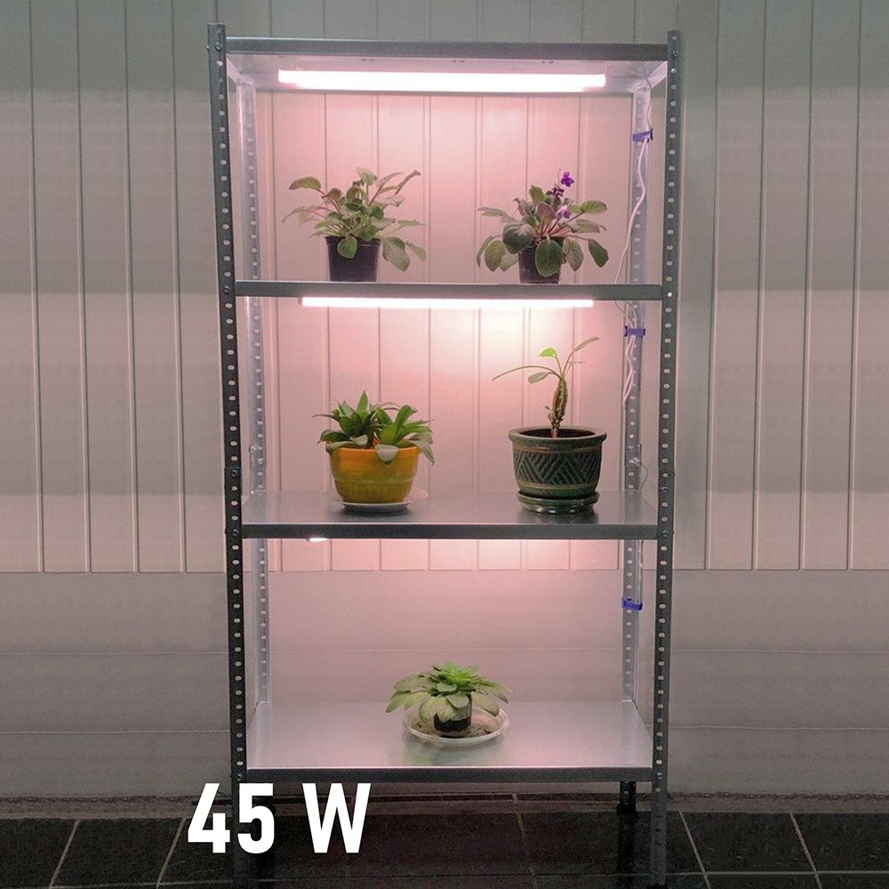 Стеллаж имеет оптимальную высоту полок 41-42 см. и идеален для выращивания растений и рассады в домашних условиях. Укомплектован тремя фито светильниками специального спектра свечения "Фотосинтез" мощностью 15 Вт каждый. Все фитосветильники связаны и питаются от сети 220 V через единый провод и розетку, при этом каждая из ламп оборудована собственным выключателем. Все светильники мобильны, легко отделяются от общей конструкции и монтируются на свои места, поэтому удобны в траспартировке и использовании для досветки растений в парнике или теплице.