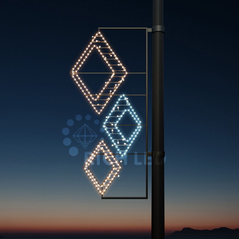 Панель-кронштейн "Ромбы":Высота: 149 смШирина: 68 смВлагозащищенность: IP65Каркас: МеталлическийМатериал: Дюралайт, НитьНапряжение: 220 ВПотребляемая мощность: 32 Вт