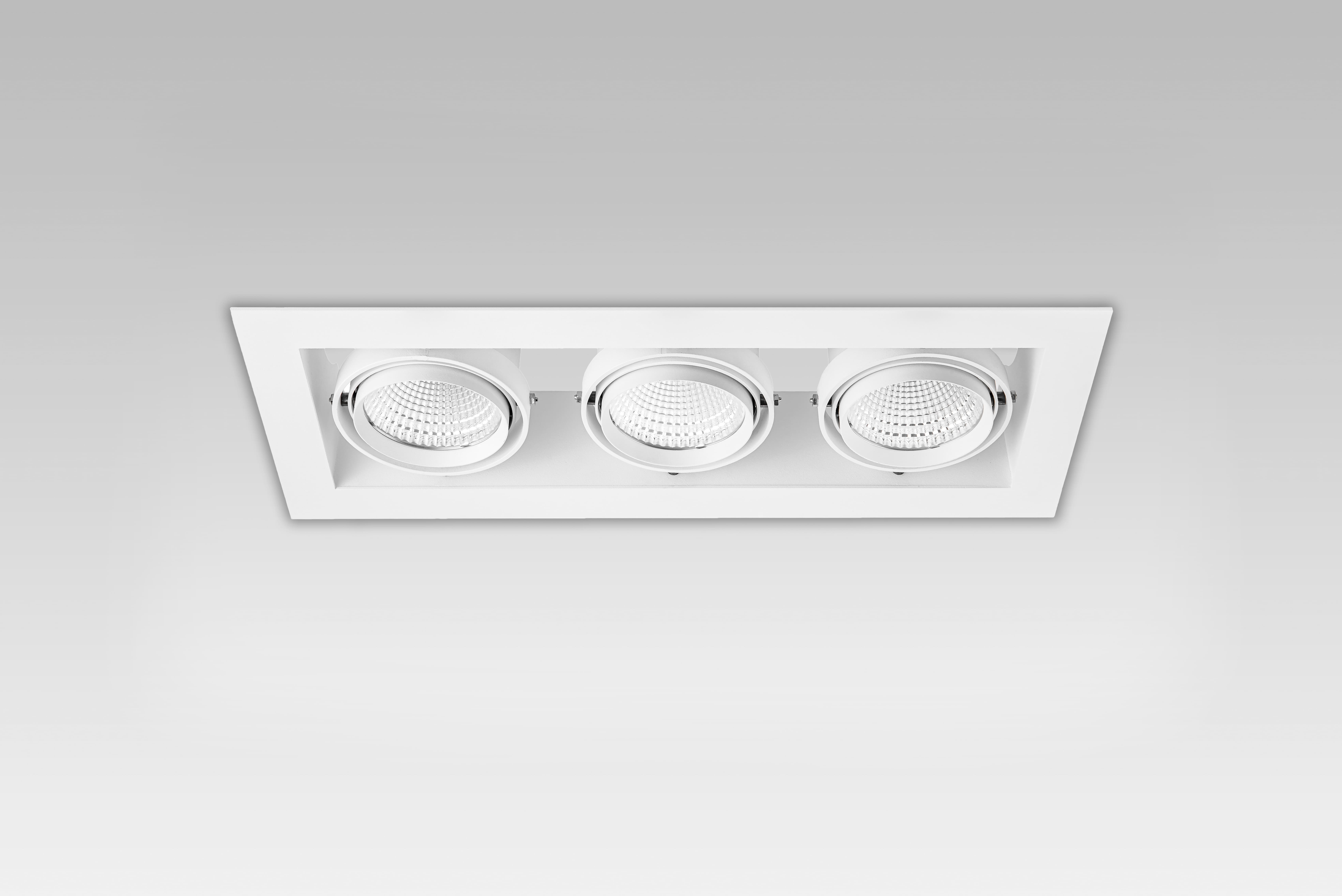 Тройной поворотный светильник для общего освещения. Позволяет направить поток каждого модуля в нужном направлении, создавая равномерный свет, который не перебивает дневной. Является практичной заменой металогалогеновых карданных светильников. Матовый рассеиватель создает мягкую и равномерную засветку на поверхности объекта, обеспечивает комфортное освещение для работы. Удобно использовать для больших торговых пространств с высоким потолком типа грильято.