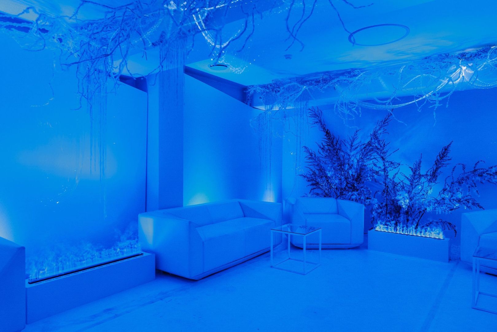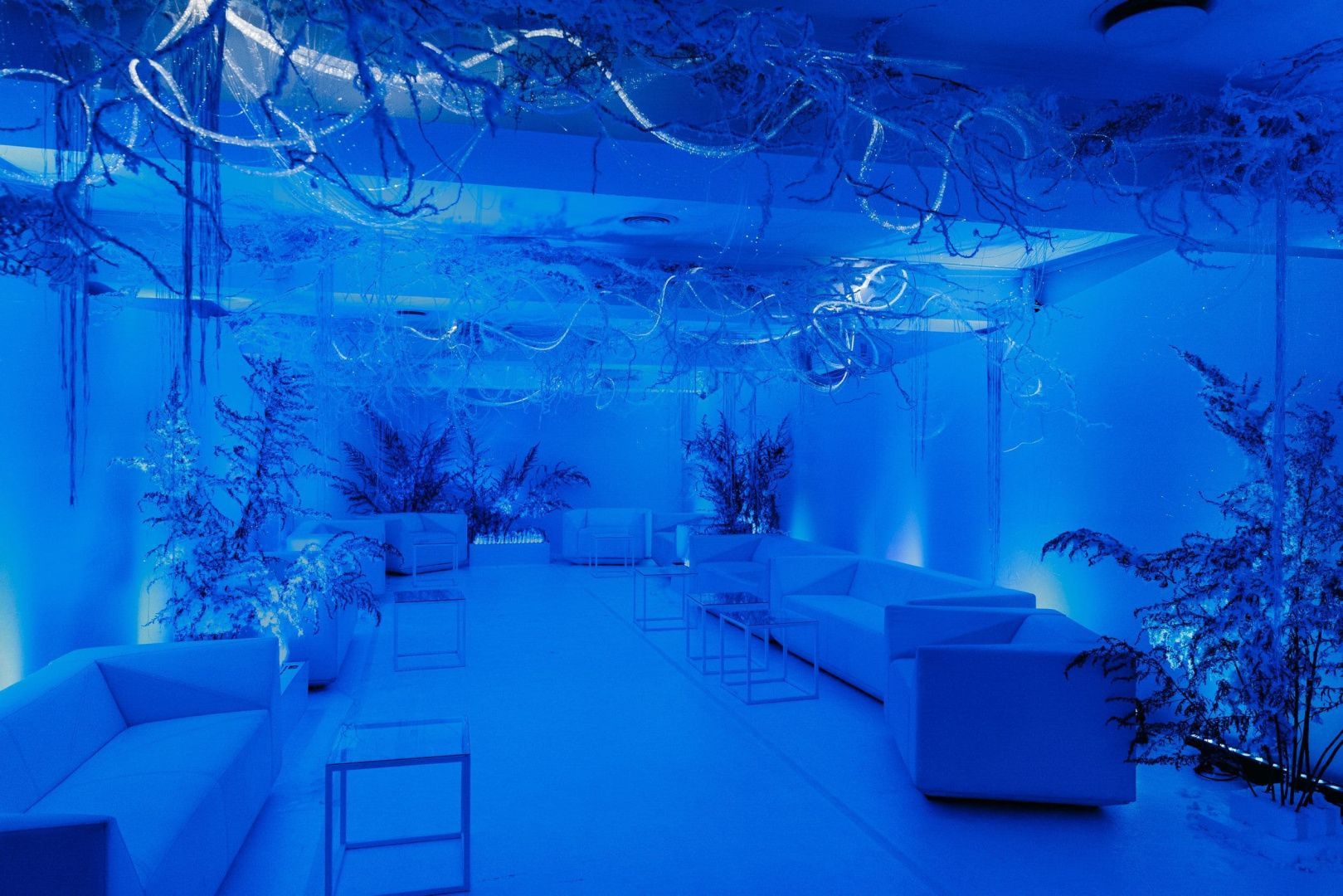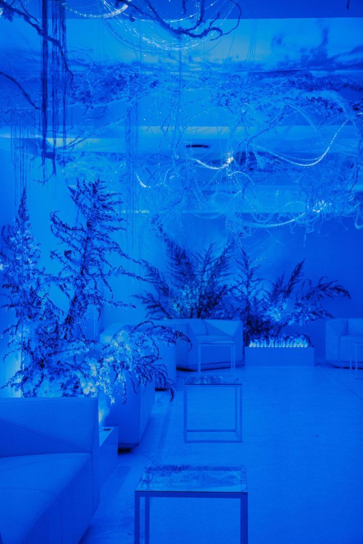 Световое оформление мероприятий - задача, которая требует многоуровневого подхода и учета целой плеяды переменных: от тематики праздника до характеристик и возможностей используемого пространства. Для декорирования лаундж зоны мы использовали оптоволоконную нить бокового свечения с насечками. Благодаря удаленности источника света она безопасна: не нагревается и не проводит электричество, а композиция ее расположения может быть легко переоформлена даже перед началом ивента, позволяя импровизировать по настроению и ожиданиям заказчика. Программируемые источники света для оптоволокна не только открывают возможности для создания собственных оттенков свечения, но и позволяют менять их по своему усмотрению уже в процессе мероприятия, создавая волшебную атмосферу праздника.