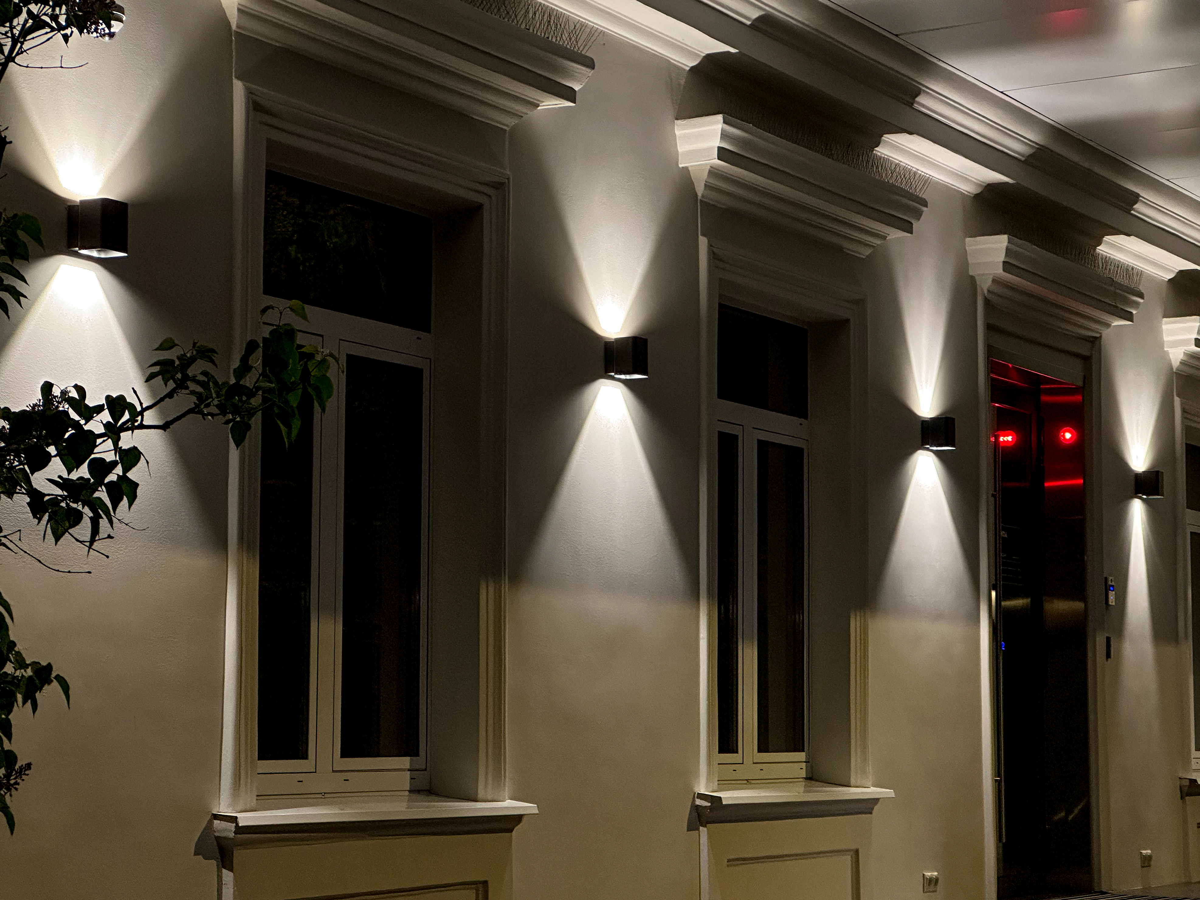 LGD-Wall-Vario — уличные накладные светильники с направленным вверх-вниз тёплым светом (3000 К) и регулируемым углом излучения (0–80°). Геометричность + защита IP54 = идеальное решение для архитектурного ритма фасада.