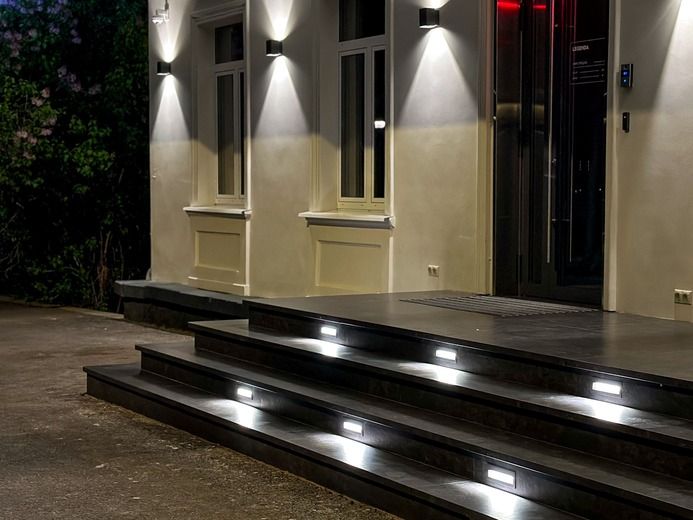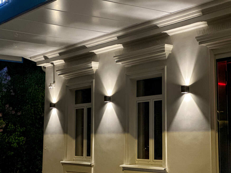 LGD-Wall-Vario — уличные накладные светильники с направленным вверх-вниз тёплым светом (3000 К) и регулируемым углом излучения (0–80°). Геометричность + защита IP54 = идеальное решение для архитектурного ритма фасада.