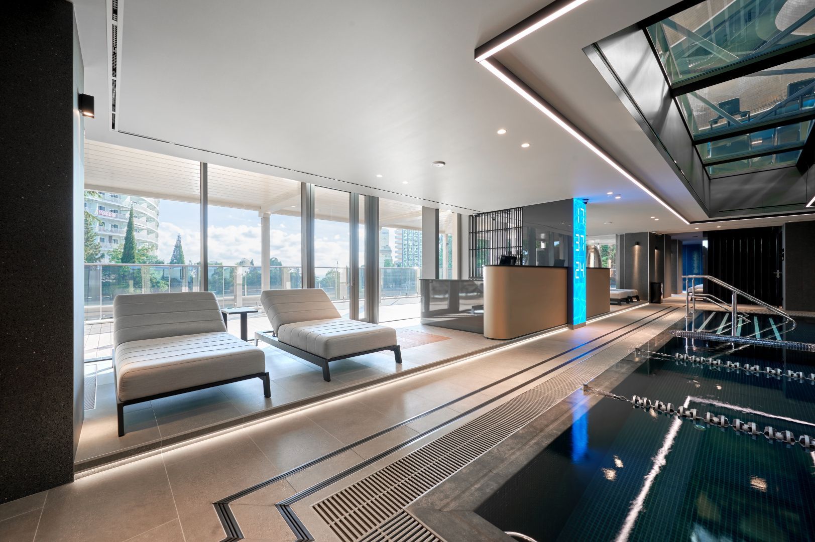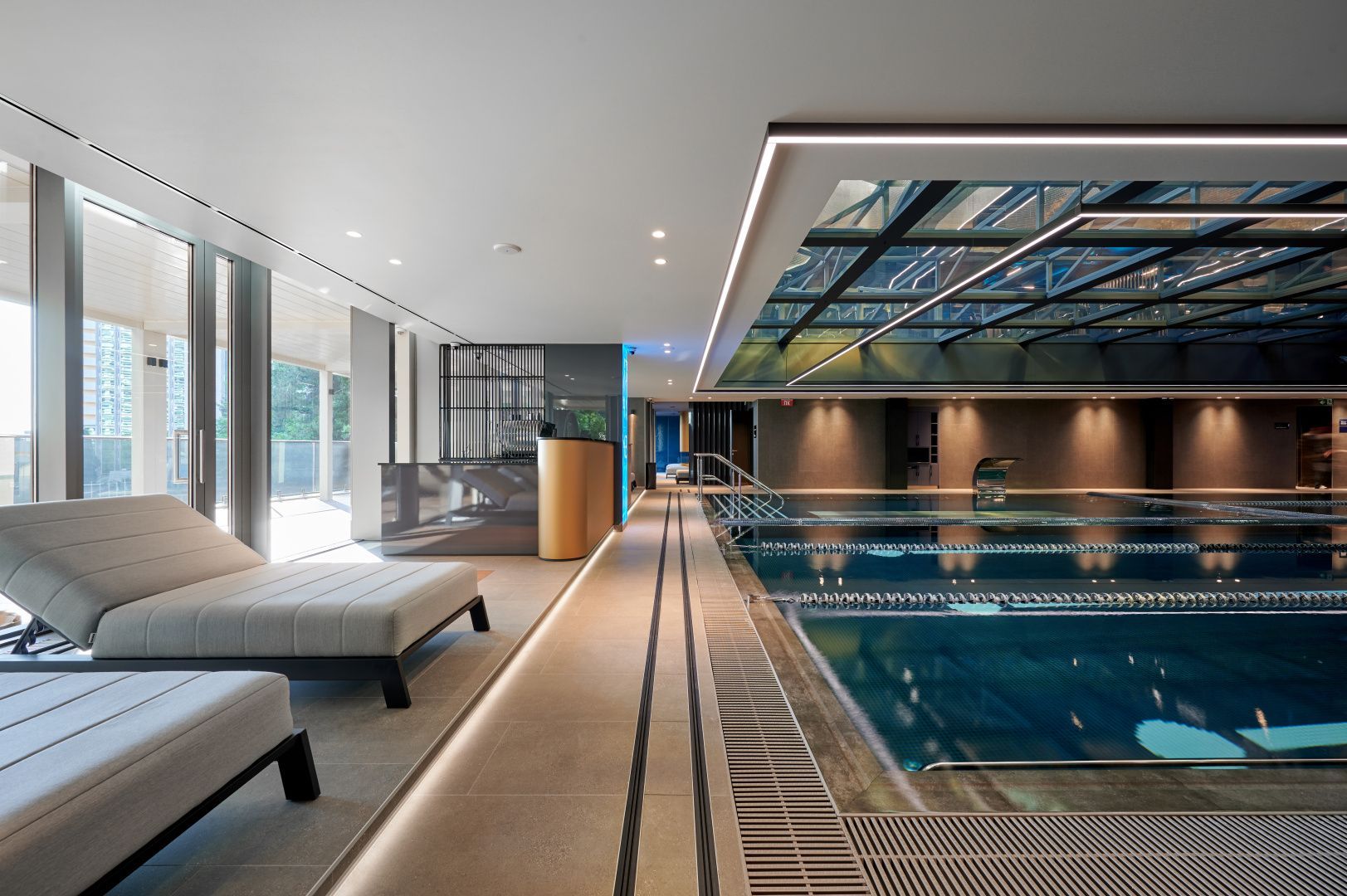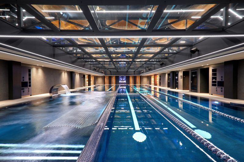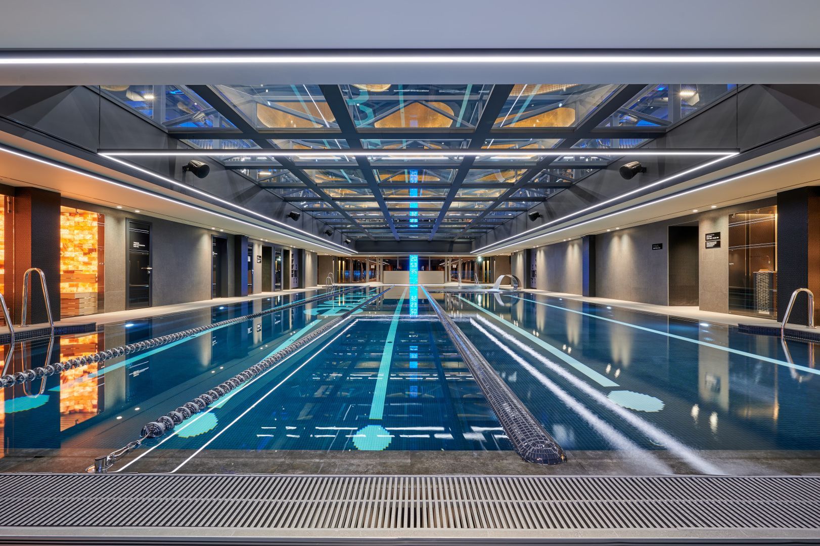 Визитная карточка клуба — 25-ти метровый бассейн. Для его освещения по периметру специалистами компании Lightwerk была выбрана влагозащищенная (IP68) светодиодная лента Arlight белого свечения RTW-PFS-A60-11mm 24V Day4000 (034158). Лента установлена в профиль ARH-DECORE-S12-LINE-EDGE-2000 ANOD (023894) с рассеивающим экраном ARH-DECORE-S12 Flat Opal (023906) для комфортного и безопасного освещения в любое время суток.