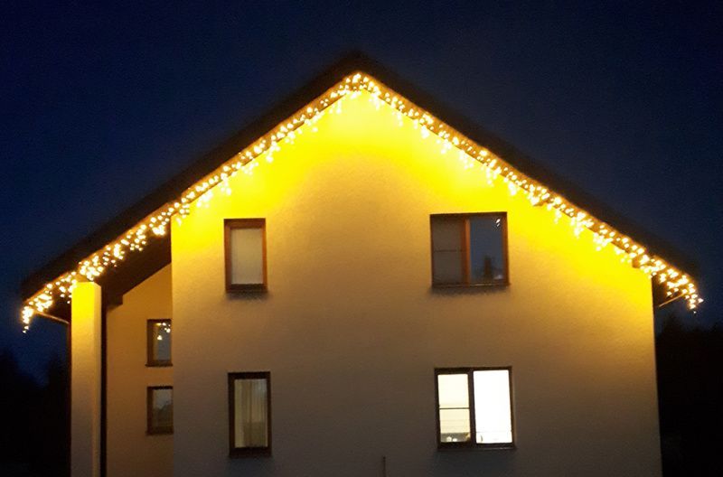 Эффект мерцания данной гирлянды 180-200 вспышек в минуту, цвет мерцающих светодиодов - теплый белый (3000K). Напряжение питания 230 В, потребляемая мощность 8 Вт, степень пылевлагозащиты IP65.