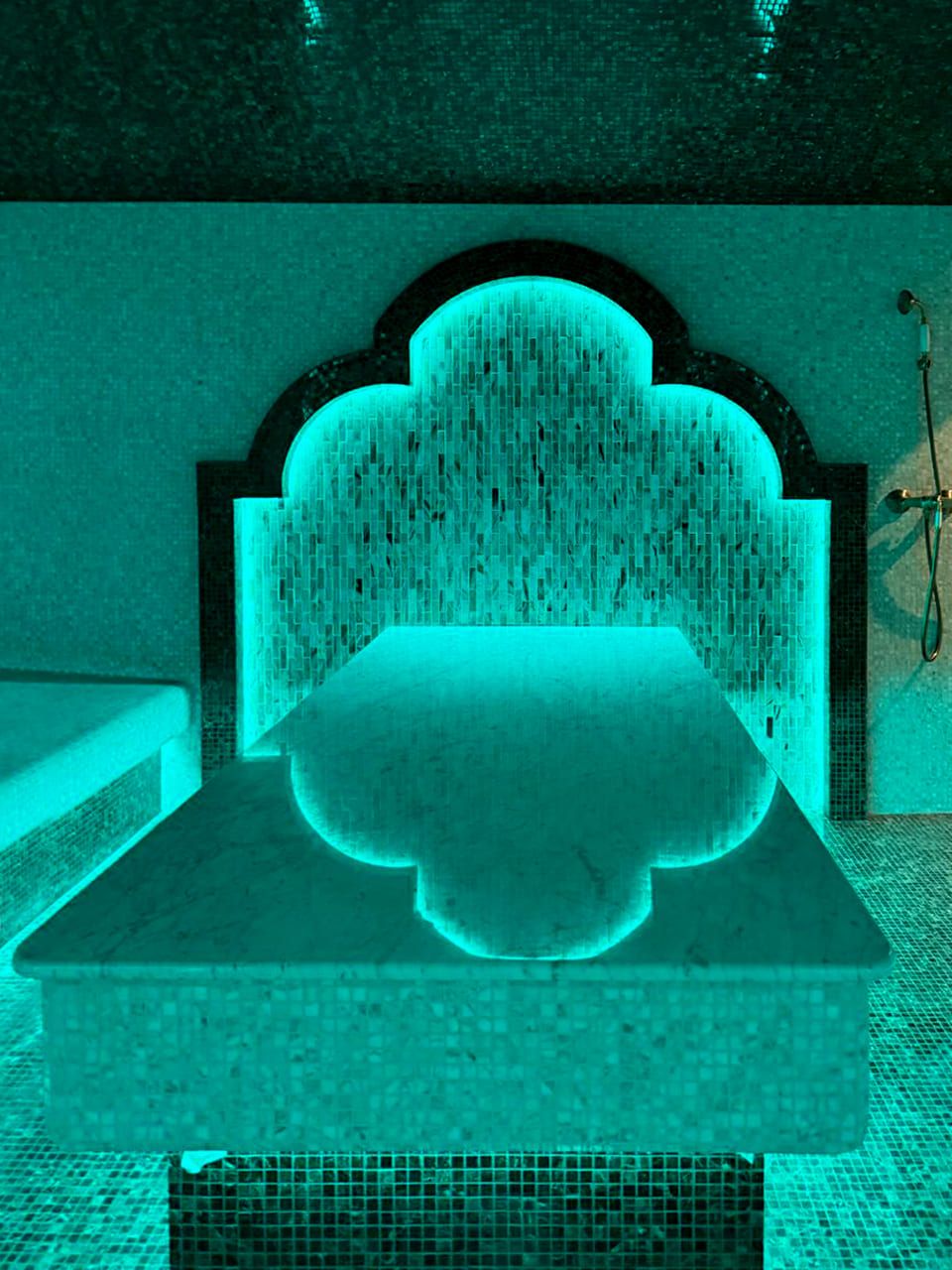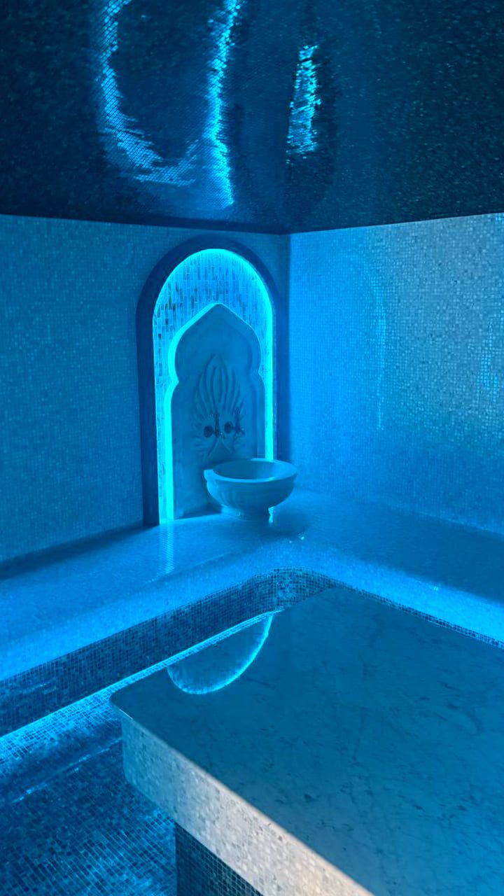 Такой свет подчеркивает архитектуру хаммама и делает ее живой. Отражения на мозаике, мерцание на куполе, игра света в паре — всё это создаёт ощущение восточного уюта и роскоши.